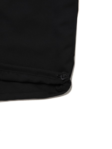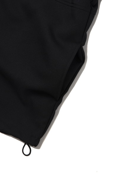 帯電防止に優れたストレッチポリエステルツイル地を使用。脇接ぎにスリットポケットが付く。裾にドローコードが付く。ワイドシルエット。