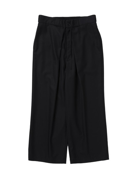 特殊加工により防シワ性を持つ。 ・ドローストリングのバックゴムイージー仕様。前開き有り。 ・通常より大きく畳んだインタックを施したワイドシルエット。