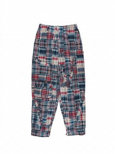 多様なポケットが配置されたオリジナルカーゴパンツ、パッチワークのような印象の複雑なチェックの織り生地を採用しています。