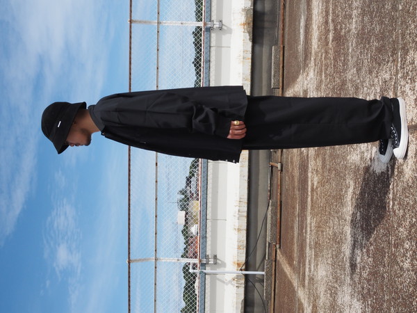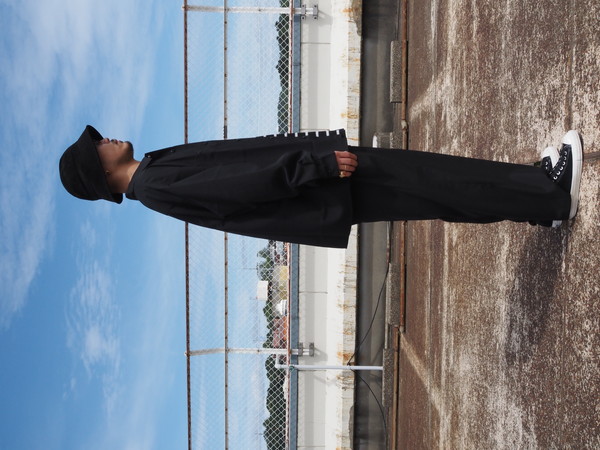 ドローストリングのイージー仕様。前開き有り。 2タックのワイドシルエット。