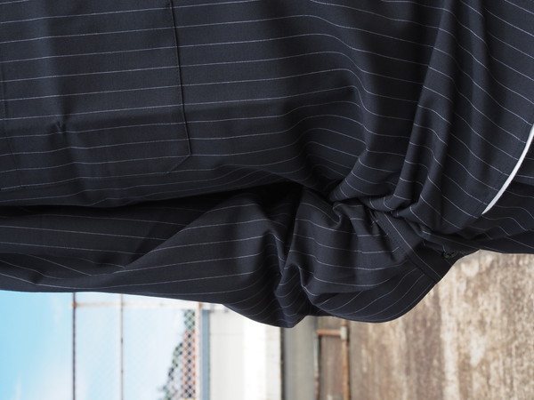 光沢とドレープが特徴のウールとポリエステル混紡の ウォッシャブル平織生地を使用。