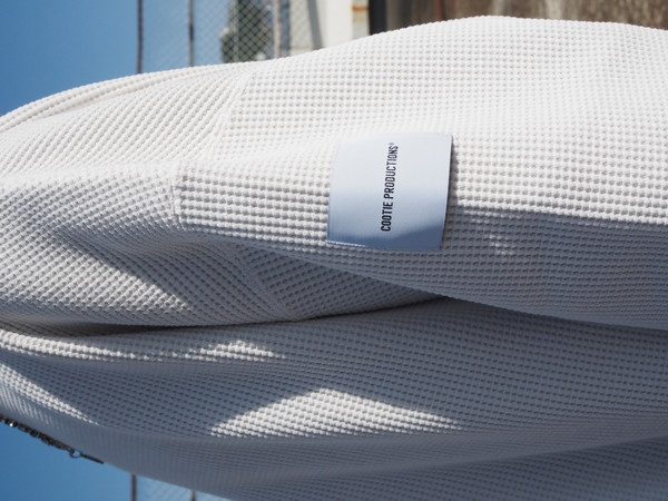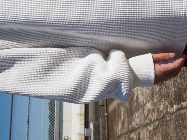 N/C混紡糸を度詰めで編み上げたオリジナルのワッフル生地を使用。