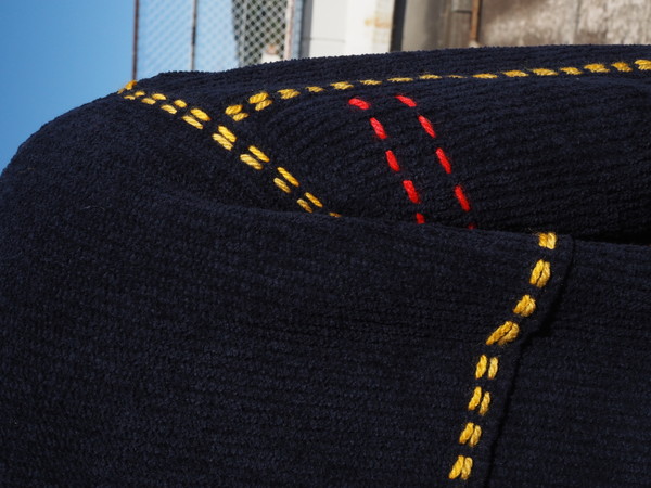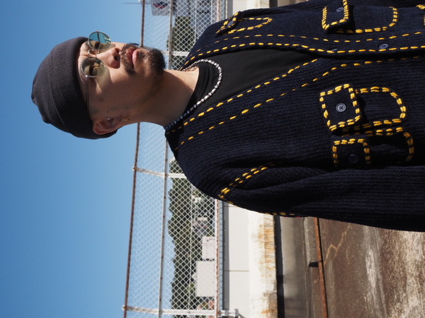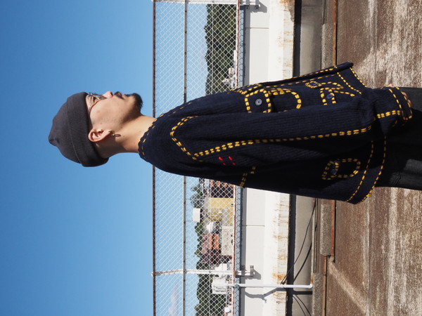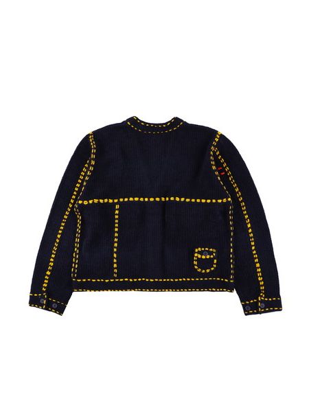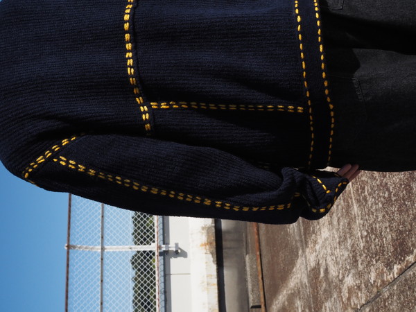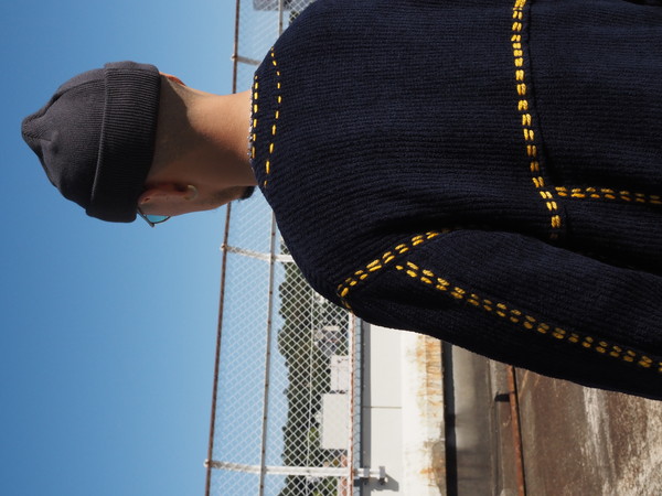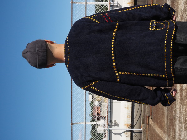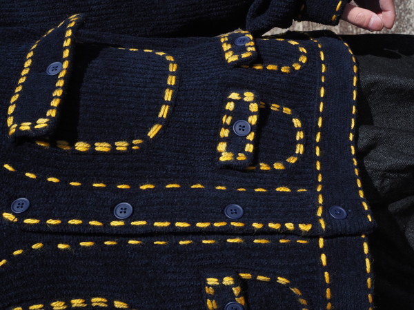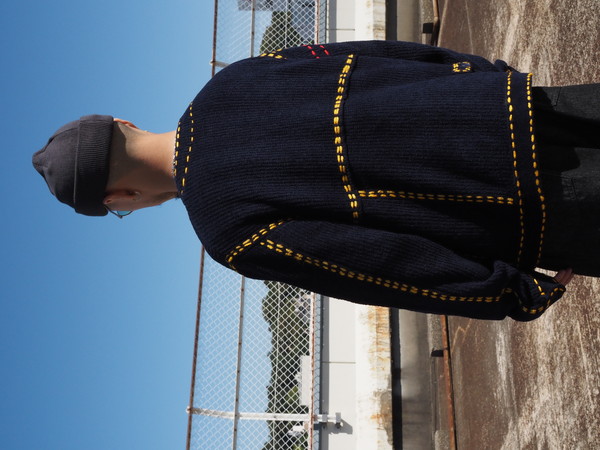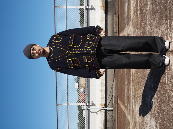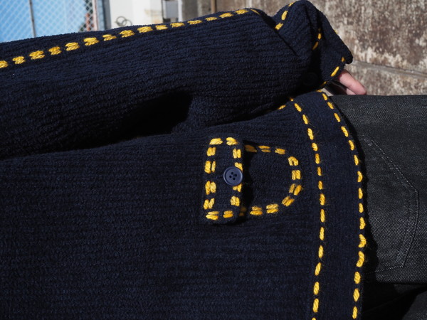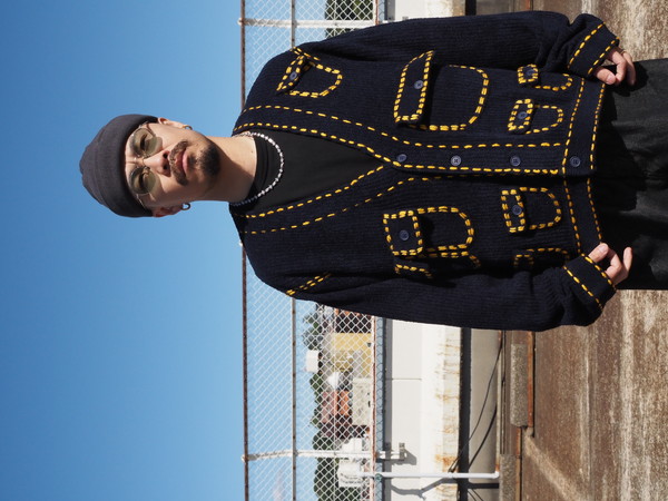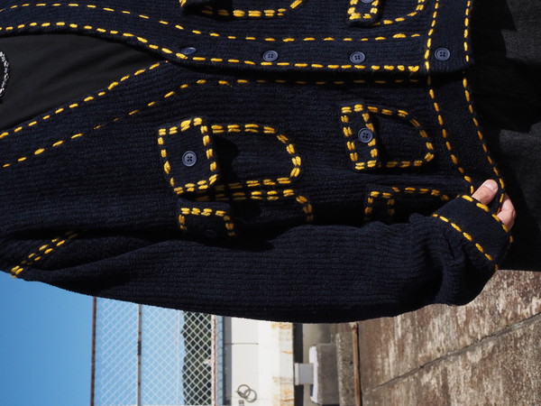 固いイメージのあるユーティリティアイテムを、文字通り柔らかい雰囲気で表現したユーモラスなカーディガンです。