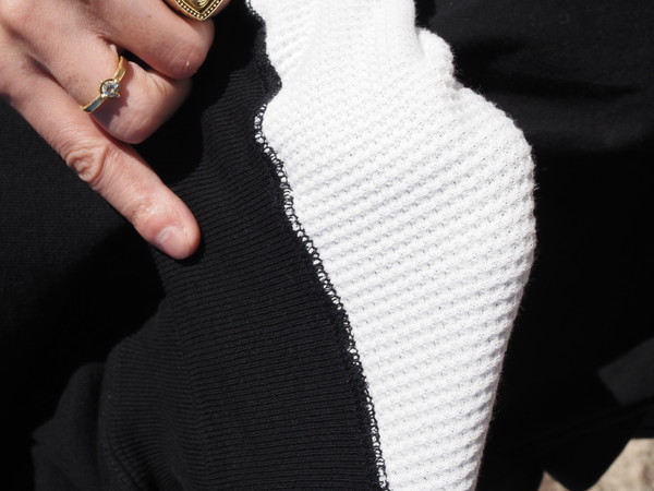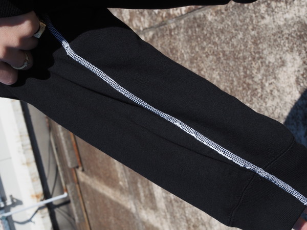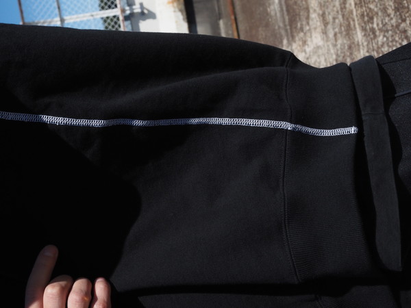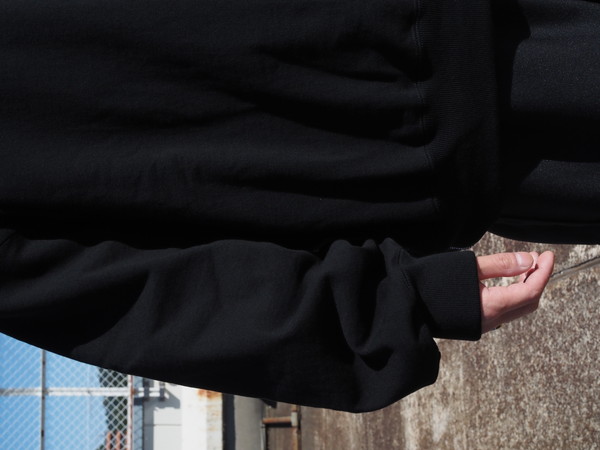 表の裏毛の太番手の目面に対してサーマルと合わせたときに心地よい厚みになるようにバランスをとった糸使いで作成。