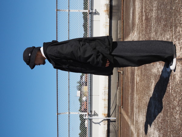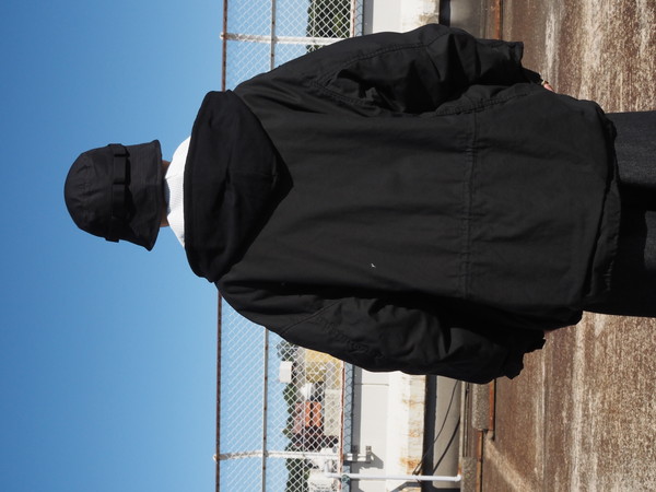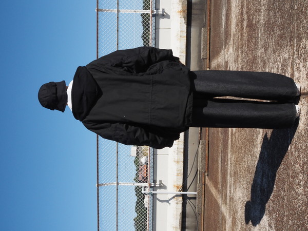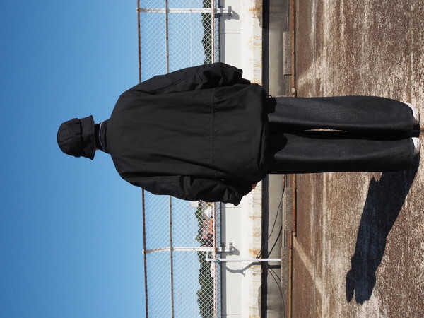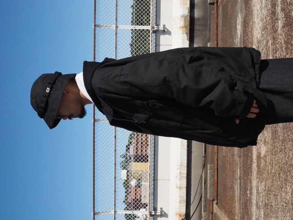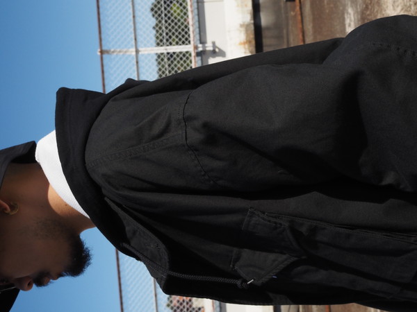 スタンドカラーは内蔵されている簡易フードを省き、納まりがよく、程よい厚みを持たせたシルエットに仕上げた。