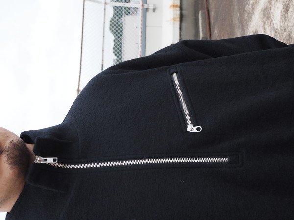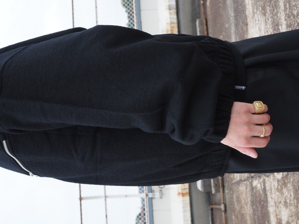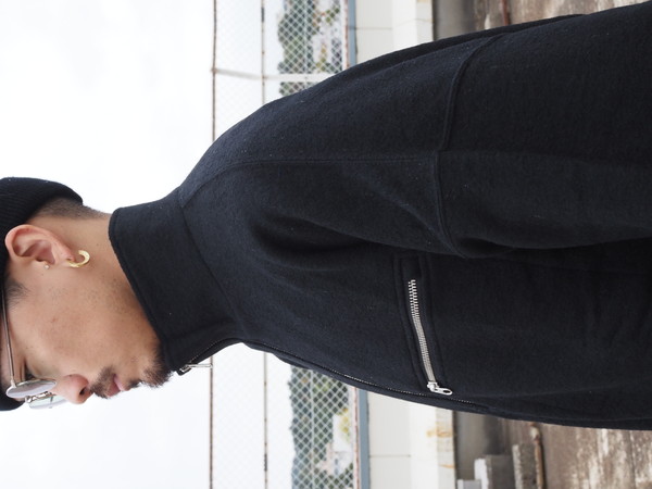 ウールブークレ糸の天竺編みを縮絨することにより作成したオリジナルファブリックを使用。