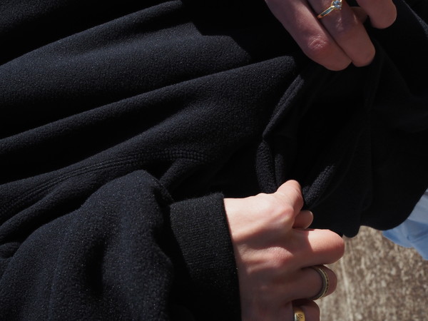 毛足が短い両面起毛の難燃フリースを使用。 ・脇接ぎにスリットポケットが付く。