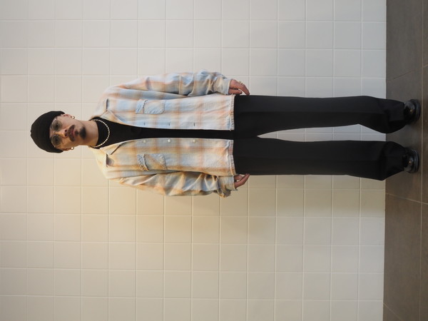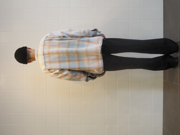 オープンカラー型のチェックシャツ。短丈のボックスシルエット。