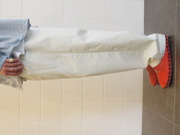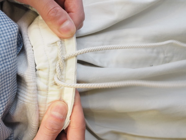 上品な光沢とハリ、コシを持つウエストポイントを使用。 ドローストリングのイージー仕様。