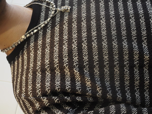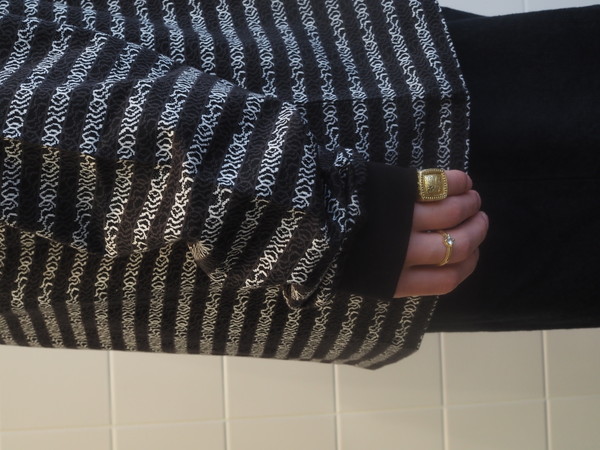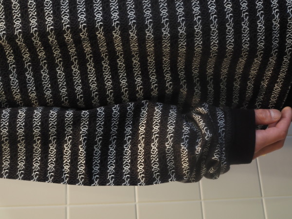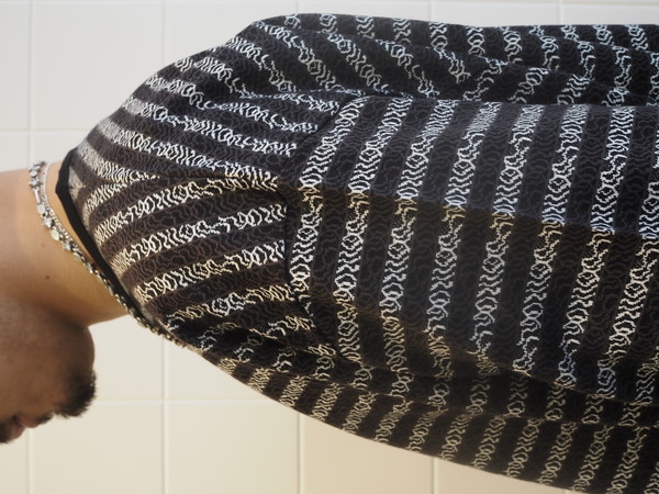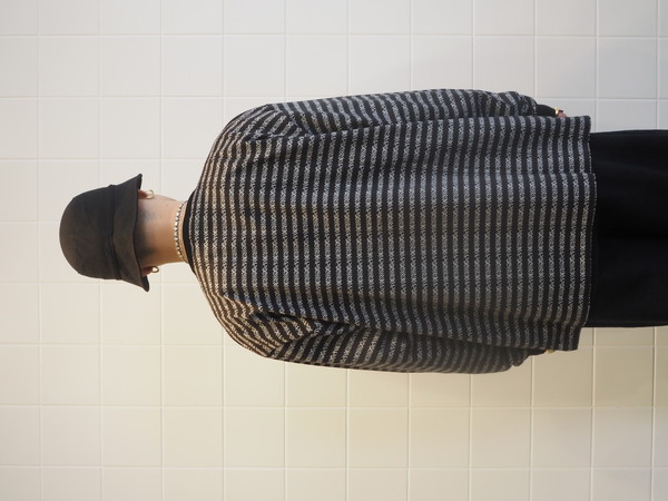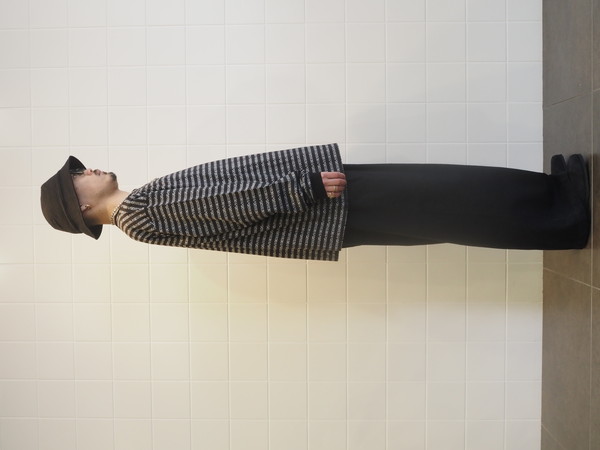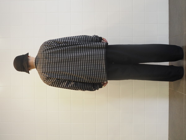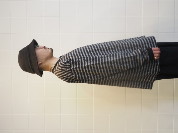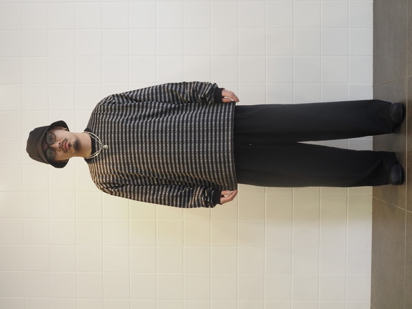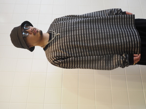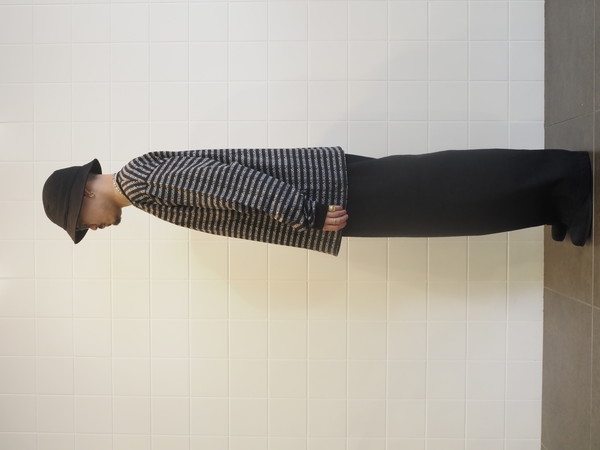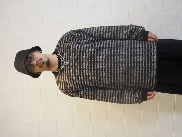 細番手スーピマ糸を使用し編み上げた度詰めジャガードボーダーを使用。 光沢のあるクリーンな雰囲気が特徴。 ワイドシルエット。