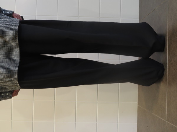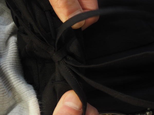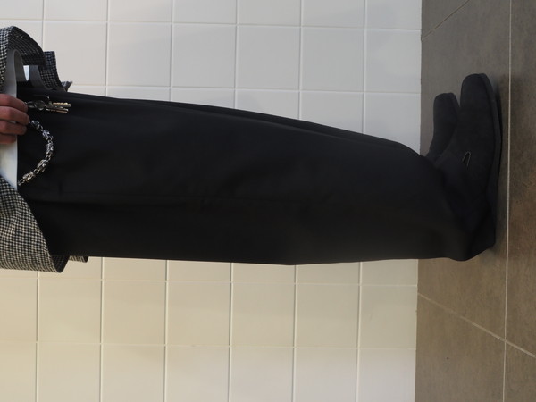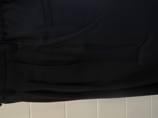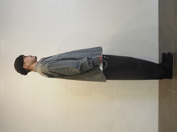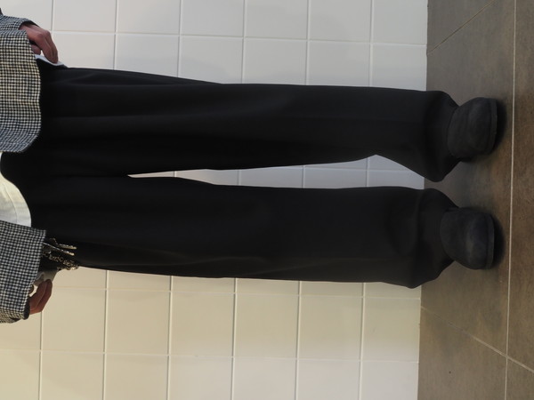 美しい光沢とドレープを持つ。 ドローストリングのバックゴムイージー仕様。 前開き有り。 2タックのワイドテーパードシルエット。