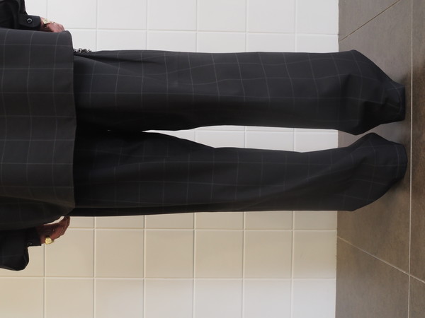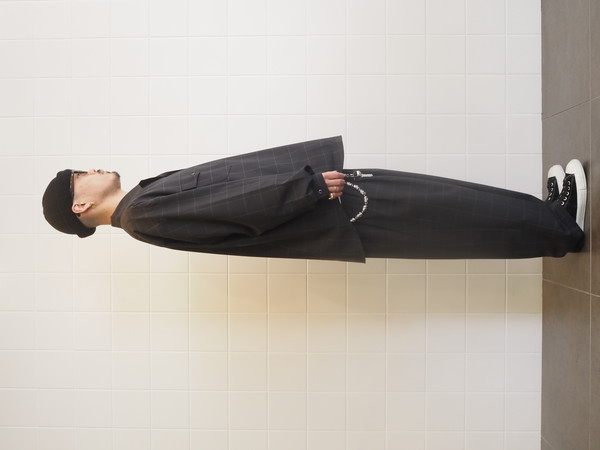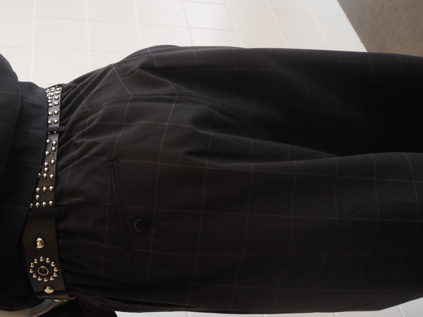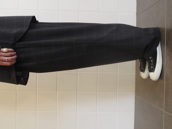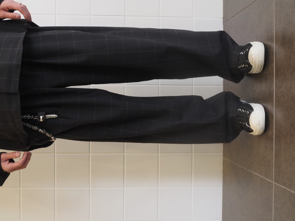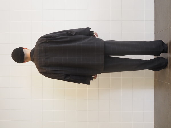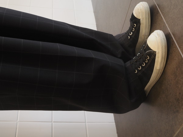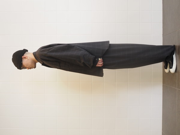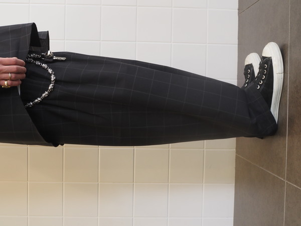 ドローストリングのイージー仕様。前開き有り。 2タックのワイドシルエット。