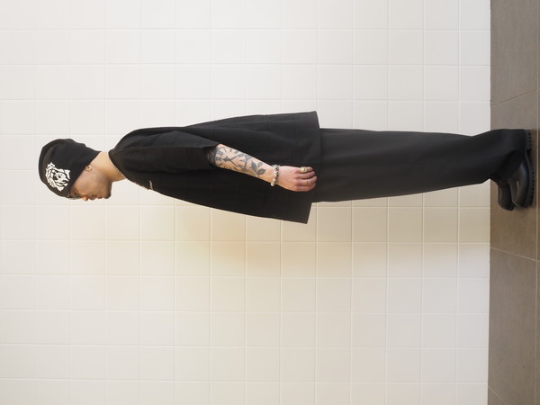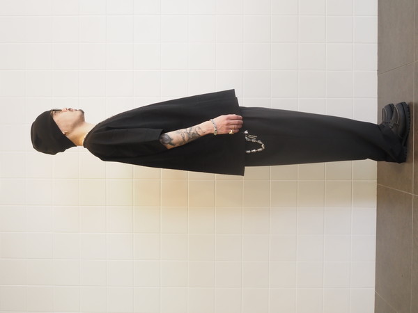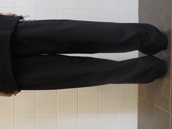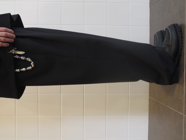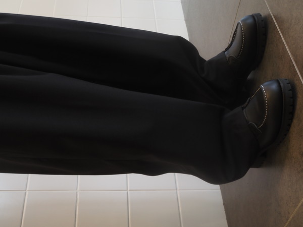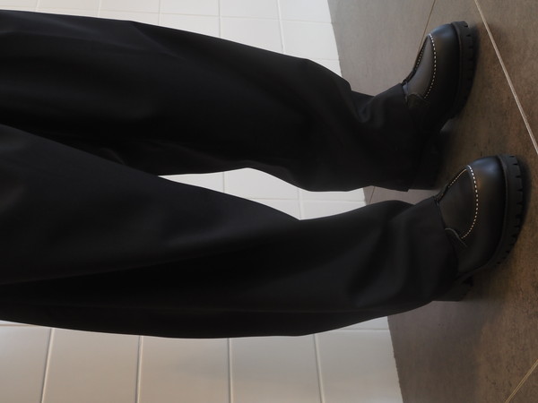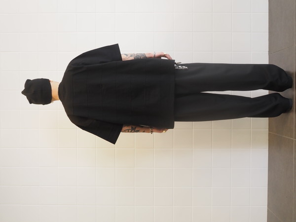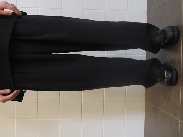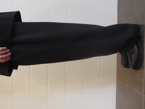 ドローストリングのイージー仕様。前開き有り。 2タックのワイドシルエット。