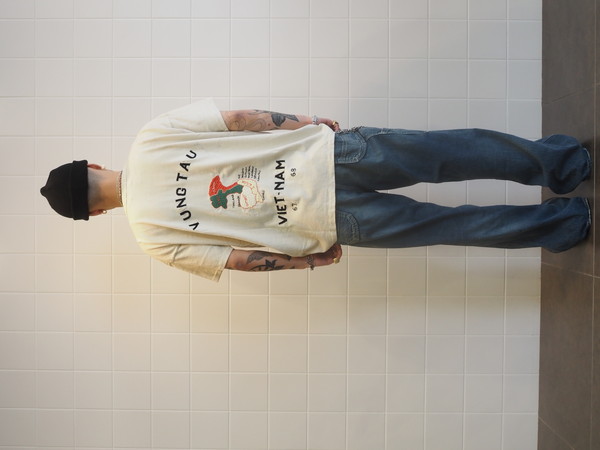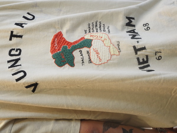 ベトナム戦争期、現地で兵士自身が刺繍を入れたスーベニアジャケットの空気感を、そのままTシャツに落とし込んだデザイン。